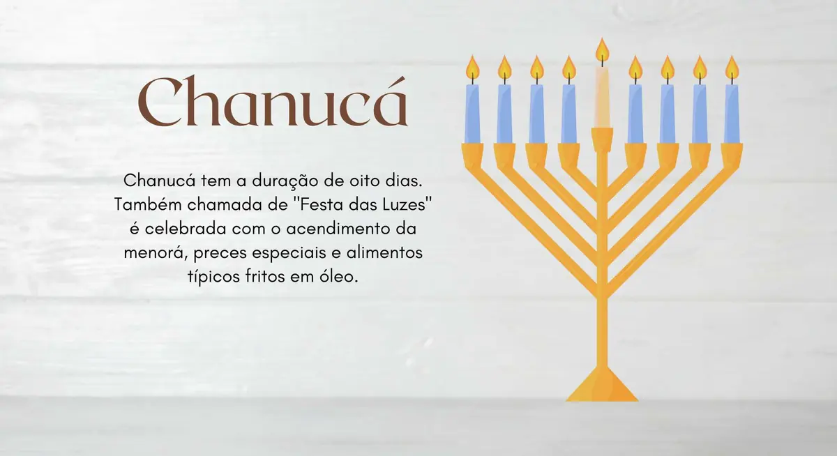 Hanukkah ( Chanucá ) é o "festival das luzes" judaico de oito dias, no inverno, celebrado com o acendimento noturno de uma menorá , orações especiais e alimentos fritos.